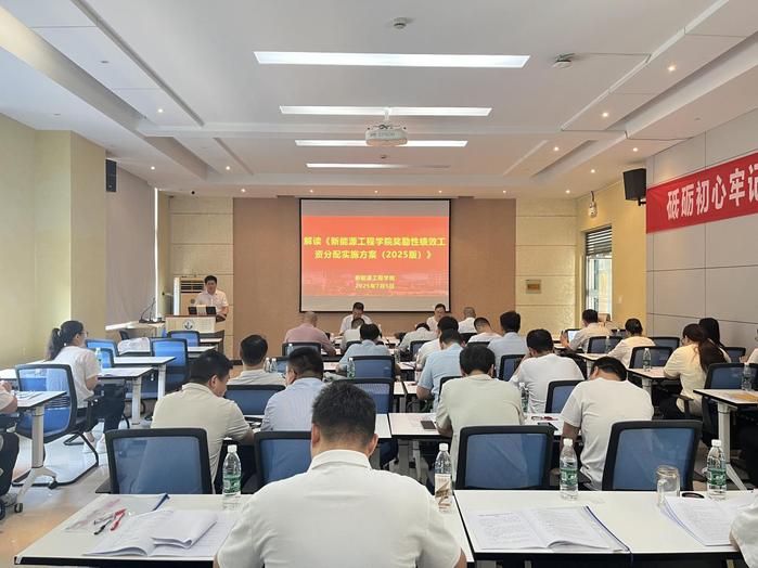 9时25分,开幕式正式开始。全体与会人员起立,奏唱国歌。随后,徐新斌发表致辞,对大会的召开表示热烈祝贺,并期望代表们能够积极发言,为学院的发展贡献智慧与力量。9时50分,正式会议拉开帷幕。副院长(主持工作)张刚首先对《新能源工程学院奖励性绩效工资分配实施方案(2025版)》(审议稿)进行了解读,详细阐述了方案内容及分配细则。随后,徐新斌解读《新能源工程学院教职工年度考核办法(2025版)》(审议稿),明确了考核标准及原则。随后经过分组讨论,代表们充分发表了各自意见和建议。在此基础上,主席团成员会议进行了深入商讨。在闭幕式上,经全体代表表决,审议一致通过《新能源工程学院奖励性绩效工资分配实施方案(2025版)》《新能源工程学院教职工年度考核办法(2025版)》。