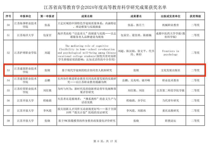 根据《关于公布2024年度高等教育科学研究优秀成果奖的通知》(苏高教会〔2025〕25号),我院张刚博士主持的《基于现代学徒制的校企协同育人机制研究》获得江苏省2024年度高等教育科学研究优秀成果奖二等奖,此次评选由江苏省高等教育学会组织,共收到全省97所高校推荐的论文、著作和报刊文章等459项,最终评选出特等奖9项、一等奖22项、二等奖129项,合计奖项160项。