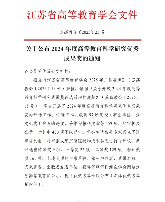 我院成果获江苏省2024年度高等教育科学研究优秀成果奖